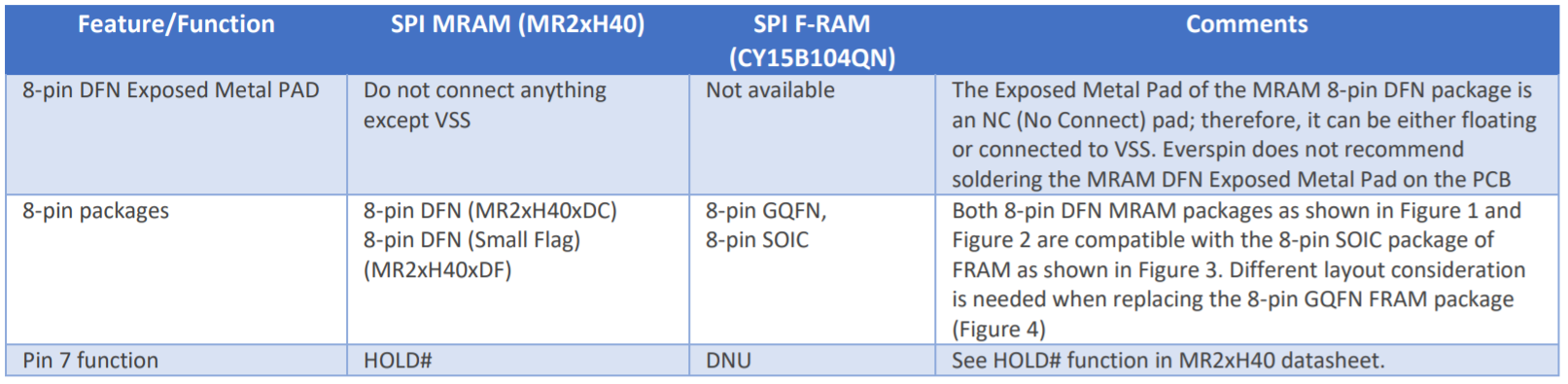 MR2xH40xDF是組織為512Kx8的4Mb非易失性RAM,采用標(biāo)稱3.3V電源供電,并且與FRAM兼容。它提供標(biāo)準(zhǔn)的8引腳小標(biāo)志DFN(DF版)和8引腳DFN(DC版),它們是多功能封裝選項(xiàng),可以用SPI-FRAM8引腳SOIC和8引腳GQFN替代它。包(表1)。從硬件的角度來(lái)看,關(guān)鍵的區(qū)別在于用于封裝引腳(引腳7)的PCB的變化。從軟件的角度來(lái)看,這兩個(gè)設(shè)備之間的主要區(qū)別在于引腳7的功能和設(shè)備ID。當(dāng)主機(jī)CPU必須中斷存儲(chǔ)器時(shí),使用MR2xH40xDF的HOLD#引腳(引腳7)另一個(gè)任務(wù)的操作。當(dāng)HOLD#為L(zhǎng)OW時(shí),當(dāng)前操作被掛起。設(shè)備將忽略SCK或CS#上的任何過(guò)渡。當(dāng)SCK為低電平時(shí),必須在HOLD#上進(jìn)行所有轉(zhuǎn)換。如果不使用,此引腳必須連接到VDD。可能需要更改硬件和軟件才能在MRAM上啟用HOLD#功能。