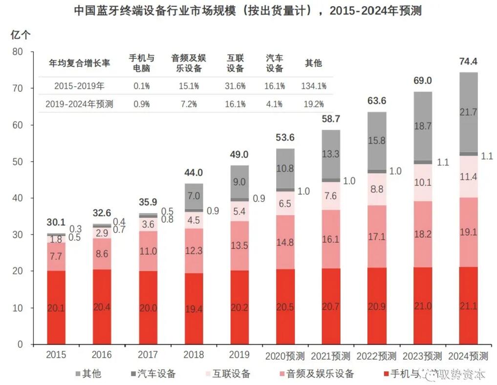 藍牙芯片在音頻傳輸、數據傳輸和位置服務及設備互聯領域的滲透率持續上升,推動藍牙芯片終端設備由2015年的30.1億個增長至2020年的49.0億個。