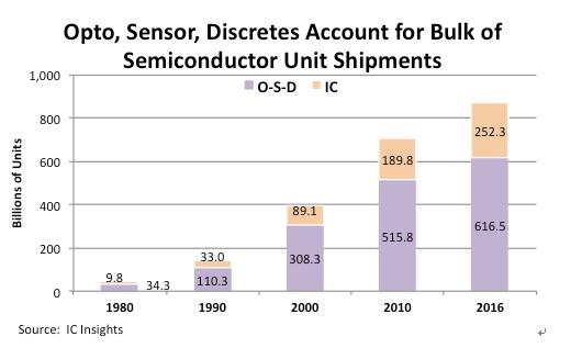 雖然集成電路技術(shù)不斷發(fā)展,越來越多的功能被集成到一顆存儲芯片中,從而以系統(tǒng)的角度來看用到的芯片數(shù)量越來越少,但I(xiàn)C Insights的統(tǒng)計結(jié)果顯示,全球半導(dǎo)體出貨量中,集成電路占比依然很低,而光電器件、傳感器與分立器件(Opto-Sensor-Discrete,簡稱O-S-D)的比重仍然超過七成。