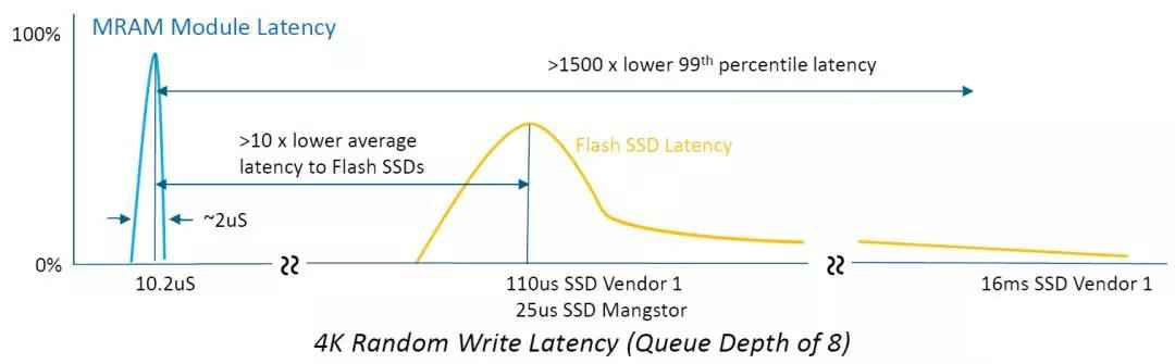 Everspin科技公司目前是全球第一家提供MRAM存儲(chǔ)芯片產(chǎn)品,目前推出最新款的產(chǎn)品STT-MRAM產(chǎn)品,單顆芯片容量可達(dá)32MB,可以做SSD固態(tài)硬盤(pán)的緩存綽綽有余,如下圖,MRAM的讀寫(xiě)延遲只有10微秒左右,而且在命令很多的情況下,延遲QoS非常穩(wěn)定,波動(dòng)在2微秒之內(nèi)。而SSD的延遲在100微秒,同時(shí)命令多了之后,延遲更長(zhǎng)。