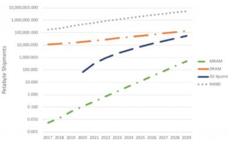 MRAM容量出貨量預(yù)測(2017-2029,Coughlin)分析人士預(yù)計,包括DRAM,3DXpoint和NAND在內(nèi)的許多存儲技術(shù)將在未來幾年內(nèi)增長,但增長最快的將是MRAM存儲器。容量方面的出貨量預(yù)計將從2019年的約0.1PB增長到2029年的近100PB。