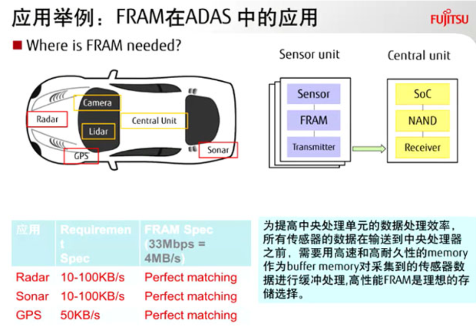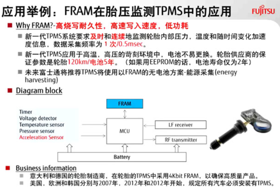 FRAM低功耗的特點能發揮優勢;另一方面,為了確保足夠的安全性,胎壓數據必須頻繁地寫入與記錄,按一秒鐘寫入一次計算,使用10年則累計寫入3.2億次。而FRAM的高讀寫耐久性使之支持寫入次數達10萬億次,性能遠高于價格親民的EEPROM,成為安全控制系統的非易失性存儲器首選。