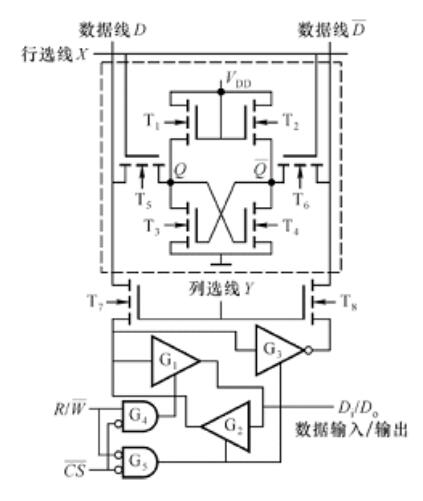其中存儲(chǔ)單元通過(guò)T5、T6和數(shù)據(jù)線(位線)相連;數(shù)據(jù)線又通過(guò)T7、T8和再經(jīng)輸入/輸出緩沖電路和輸入/輸出線相連接,以實(shí)現(xiàn)信息的傳遞和交換。寫(xiě)入信息的操作過(guò)程,在第一次寫(xiě)入信息之前,存儲(chǔ)單元中的信息是隨機(jī)信息。