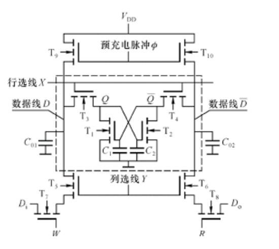 補(bǔ)充充電的過(guò)程:加預(yù)充電脈沖∅、預(yù)充電管T9、T10導(dǎo)電,CO1,C02很快充電至VDD,∅撤銷(xiāo)后,CO1,CO2上的電荷保持。然而進(jìn)行讀出操作:地址有效,行、列選線X、Y高電平;R=1,W=0進(jìn)行讀出操作,如果原信息為Q=“1”,說(shuō)明MOS電容C2有電荷,C1沒(méi)有電荷(即T2導(dǎo)電,T1截止);這時(shí)CO1上的電荷將對(duì)C2補(bǔ)充充電,而CO2上的電荷經(jīng)T2導(dǎo)電管放掉,結(jié)果對(duì)C2實(shí)現(xiàn)了補(bǔ)充充電。讀出的數(shù)據(jù)仍為,