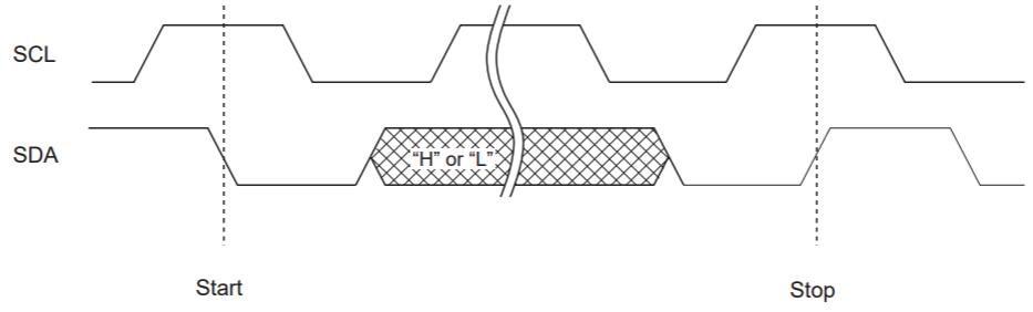 I2C總線僅通過兩條線提供通信,因此,當SCL為“L”電平時,SDA輸入應改變。但是,在啟動和停止通信序列時,SDA允許更改,而SCL為“H”電平。