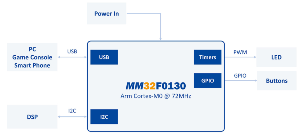 靈動微MM32F0133C7P整合USB接口與豐富的資源,在設計外接聲卡時能與DSP做連接與溝通,此外USB界面通過USB-IF certificate,無論是在接到Host端的PC/NB,Game console與Smart Phone都可以有良好的兼容性。