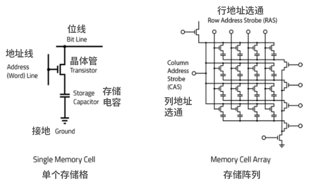 DRAM由許多重復的位元格組成,每一個基本單元由一個電容和一個晶體管構成。電容中存儲電荷量的多寡,用于表示“0”和“1”。而晶體管,則用來控制電容的充放電。
