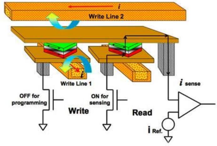 MRAM可以提供非常長的數(shù)據(jù)保留時間(+20年)和無限的耐用性。切換磁極化(Write Cycle)是在電磁隧道結(jié)(MTJ)上方和下方的導線中產(chǎn)生脈沖電流的結(jié)果(見圖1)。