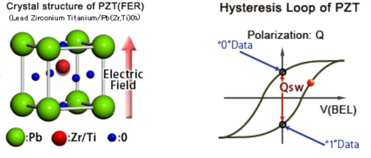 FRAM或鐵電隨機存取存儲器使用1個晶體管–1個鐵電電容器(1T-1FC)架構(gòu),該架構(gòu)采用鐵電材料作為存儲設(shè)備。這些材料的固有電偶極子在外部電場的作用下轉(zhuǎn)換為相反極性。改變鐵電極化態(tài)需要偶極子(位于氧八面體中的Ti4+離子)移動(在Pb(Zr,Ti)O3的情況下)對電場的響應(yīng)(圖4)。自由電荷或其他隨時間和溫度累積的離子缺陷會阻止這種運動,這些缺陷會導致偶極子隨時間松弛,從而導致疲勞。