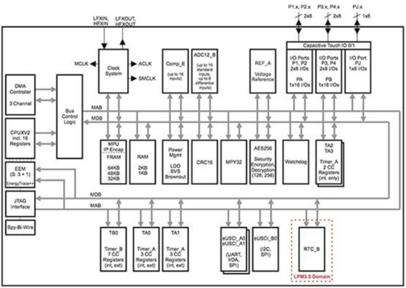 TI的MSP430FR5969是該公司低功耗MCU具有實質性芯片F(xiàn)RAM存儲(圖2)。在主動模式下,