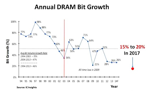 美光(Micron)表示,2017年DRAM供給位元預計成長15-20%,可說是近20年來最低的位元成長率(bit growth)。如此低的位元成長率,主要是因為DRAM微縮限制。市場上有很長一段時間都沒有任何有關(guān)DRAM微縮的消息了。當供給位元成長低于45%時,這時就是賣方的市場了。因此,DRAM的寡頭壟斷、低位元成長率,以及制造擴張遲緩,導致長期的供應(yīng)吃緊。最終的局面可能就是DRAM的價格不斷上漲,而供應(yīng)面卻不會有任何改變。